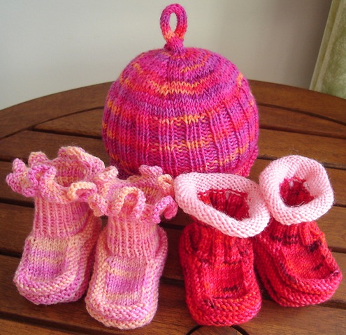 ...this isn't turning into a baby blog. I just need to get all of the itty-bitty baby booties out of my system before the end of February. I made two more pairs in Project Spectrum FIRE-colors, and a too cute hat (pdf). Just look at that handle on top of the head!